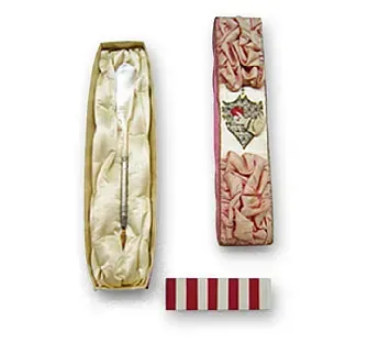 Descripció: Ploma amb el plomí de metall daurat i el mànec d’argent i nacre. La utilització d’aquesta ploma depenia del tinter, ja que no té dipòsit per al cartutx de tinta.